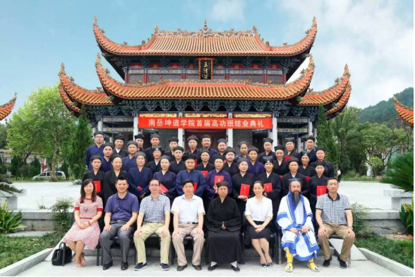 南岳坤道学院是经国家宗教事务局批准设立的3年制专科院校,也是中国目前唯一一所培养坤道人才的高等学府,由湖南省道教协会举办,南岳道教协会承办,黄至安道长任院长。学院面向全国招生,开设了宫观管理、高功科仪等专业,近年来修养培养了大批坤道人才。本届高功科仪专业培训班学员来自全国十多个省市区,是各地道观送来培养的骨干人才,共有学员30人,完成既定课程圆满毕业27人。