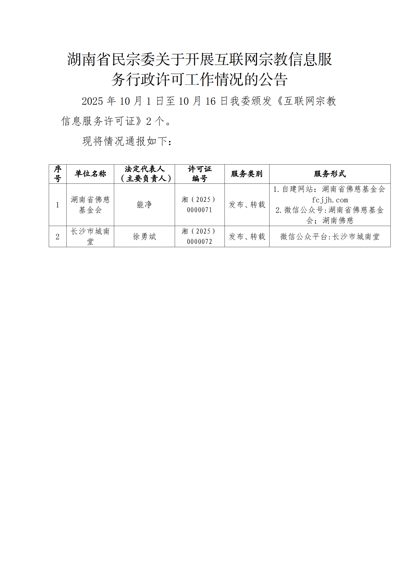 湖南省民宗委关于开展互联网宗教信息服务行政许可工作情况的公告(2025年10月1日至10月16日)