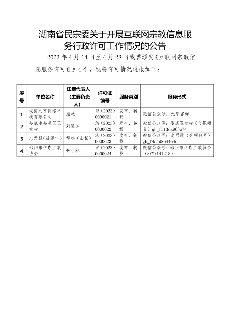 湖南省民宗委关于开展互联网宗教信息服务行政许可工作情况的公告(2023年4月14日至4月28日)