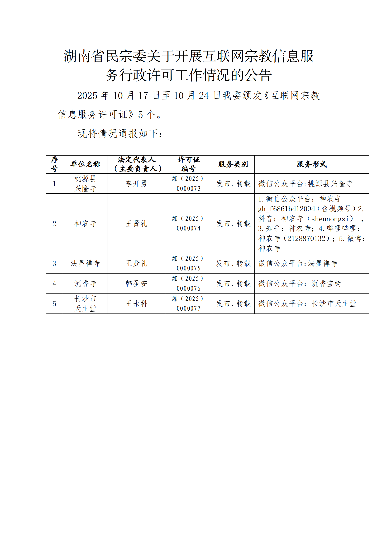 湖南省民宗委关于开展互联网宗教信息服务行政许可工作情况的公告(2025年10月17日至10月24日)