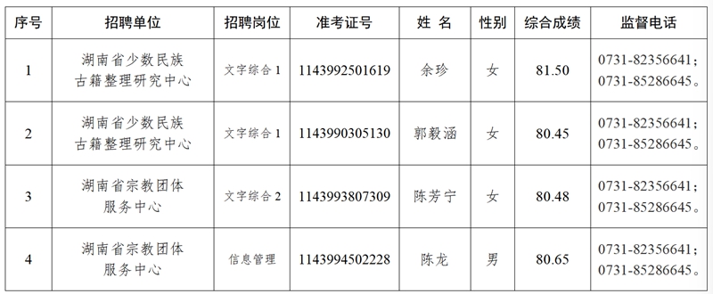 根据《湖南省省直事业单位2025年第四次集中公开招聘工作人员公告》有关要求,经报名、资格审查、笔试、面试、体检、考察等程序,确定余珍等4名同志为湖南省民族宗教事务委员会所属事业单位2025年公开招聘拟聘用人员,现予以公示。